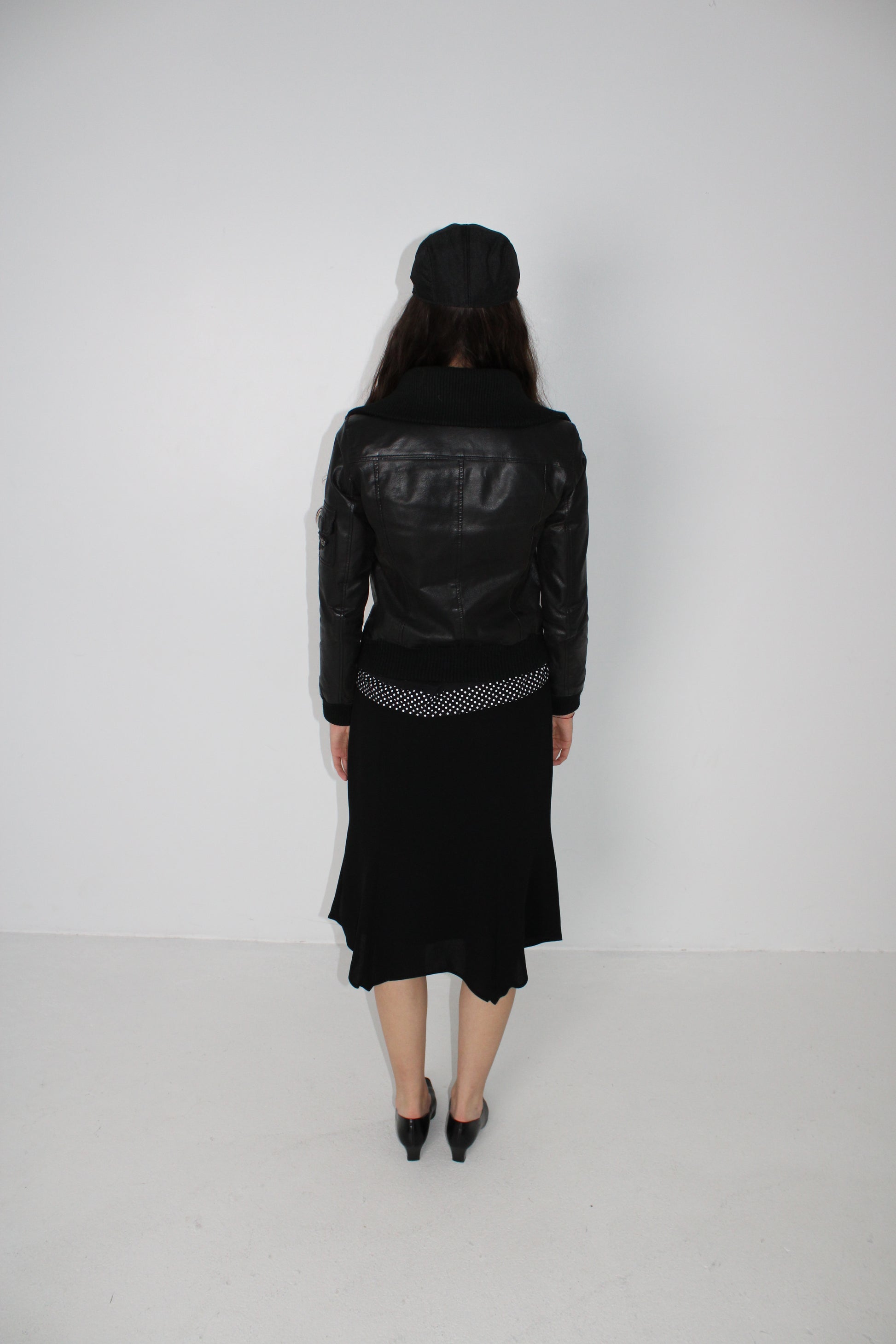 midi black skirt with an asymmetric hem line. lightweight, straight fit, silver-ware zipper on the front-left side.